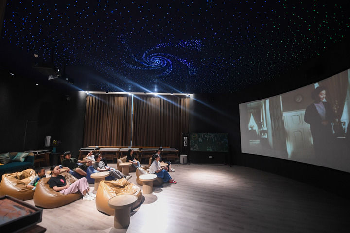 居民在位于杭州市富陽區銀湖街道硅谷社區的“合之舍”書房的影視廳內觀看電影。該書房是銀湖街道“15分鐘品質文化生活圈”的重要示范點(2022年7月2日攝)。新華社記者 徐昱 攝