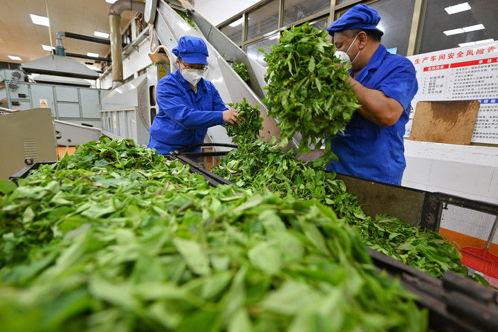2025年6月7日,工人在海南省農墾五指山茶業集團股份有限公司保亭金江五指山分公司茶廠加工茶葉。海南大葉茶是海南省中部山區特有的茶種,在2024年被證實和發現是一種新的山茶屬物種。目前,五指山、保亭、白沙等市縣不斷擴大種植規模,將茶產業作為鞏固脫貧攻堅和推進鄉村振興的重要抓手,把綠葉變成百姓致富“黃金葉”。