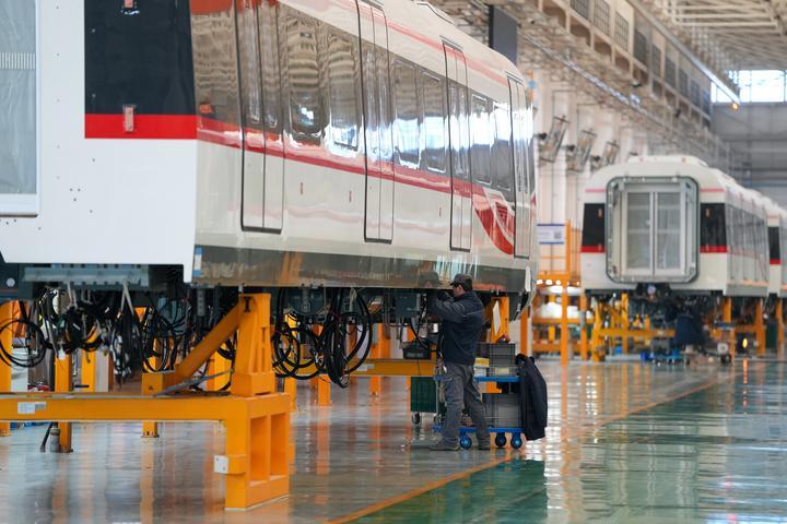 2025年2月14日,工作人員在京投裝備河北京車智能制造基地總組裝車間內工作。京投裝備河北京車智能制造基地位于河北省保定市,是貫徹京津冀協同發展戰略的重要項目?!氨本┭邪l+河北制造” 的模式,既發揮了北京的創新優勢,又拉動了河北當地的就業和經濟,對培育首都軌道交通及其關鍵零部件等上下游產業、提升河北高端裝備制造水平發揮了推動作用。