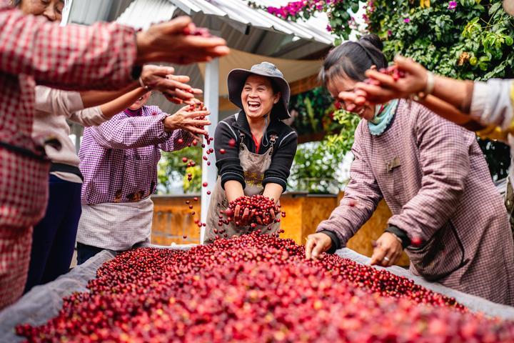 2025年1月8日,在云南省普洱市思茅區天玉咖啡莊園,工作人員慶祝今年咖啡豐收。目前,普洱市咖啡種植面積達67.9萬畝,2023到2024年產季咖啡生豆產量5.8萬噸,穩居中國咖啡種植面積與產量之首。