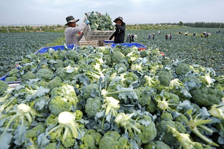 2025年7月18日,工作人員在寧夏固原市原州區彭堡鎮萬畝冷涼蔬菜基地運輸西蘭花。固原依托高海拔、氣候冷涼等“冷資源”優勢,大力發展冷涼蔬菜產業,著力打造“六盤山冷涼蔬菜”區域公用品牌。目前已建成冷涼蔬菜規?;N植基地130余個,種植面積穩定在50萬畝,年產鮮菜200萬噸以上?!傲P山冷涼蔬菜”這張打造的“綠色名片”,已成為當地鄉村振興發展之路上的“熱產業”。