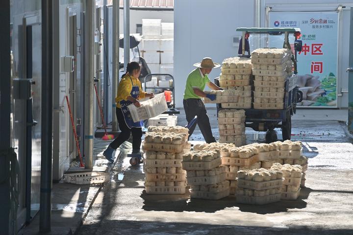 2024年10月31日,村民在廣西百色市德??h那造村食用菌生產基地搬運采摘的蘑菇。那造村通過做優特色產業、豐富村民生活、完善基礎設施等多項具體舉措,推動各項事業快速發展。