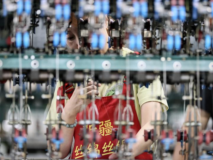 2025年7月29日,工人在新疆絲錦絲綢紡織有限公司生產車間內的自動繅絲機上作業。近年來,新疆塔城地區烏蘇市引進桑蠶繭絲綢智能化全產業鏈項目,鼓勵農民種桑養蠶,拓寬興邊富民新“絲”路。