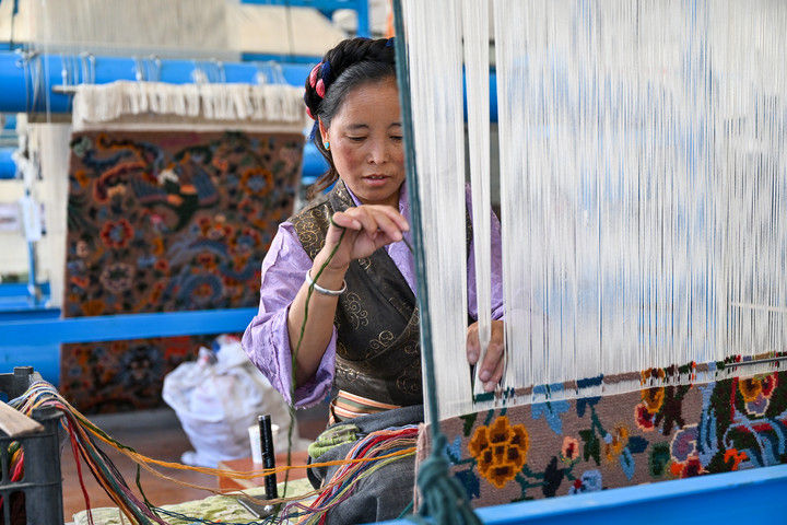 2025年7月18日,江孜藏毯文化發展有限責任公司的員工在生產車間內編織藏毯。西藏日喀則市江孜縣是著名的藏毯(藏族稱為“卡墊”)之鄉,織毯歷史悠久。藏族卡墊織造技藝于2006年被列入國家級非物質文化遺產代表性項目名錄。近年來,江孜藏毯在守護傳統技藝的同時積極創新,通過建立合作社、開辦技能培訓班等方式擴大靈活就業規模,讓更多人在家門口織藏毯增收。