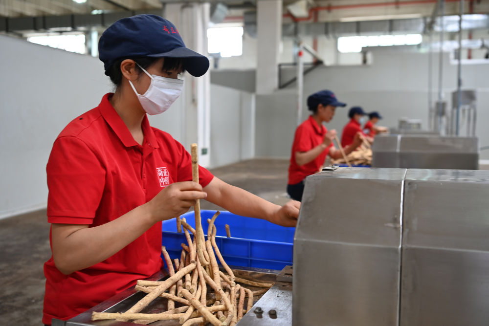 2024年7月23日,工人在甘肅定西隴西縣文峰鎮一家藥材企業加工中藥材切片。隴西中藥材種植歷史悠久,盛產300余種中藥材,是全國“道地藥材”的重要產區之一。近年來,當地通過推行產地種植標準化、藥材加工精深化、原藥倉儲規?;?、藥材交易市場化、質量監測常態化、產業發展品牌化等改革創新舉措,推動中醫藥產業高質量發展。
