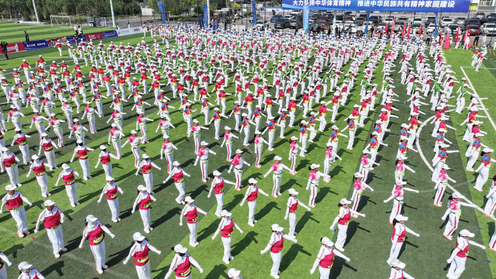 2025年6月10日,群眾在寧夏銀川市金鳳區覽山公園參加千人健身操展演(無人機照片)。當日,紀念“發展體育運動 增強人民體質”題詞73周年全民健身主題活動在覽山公園舉行。