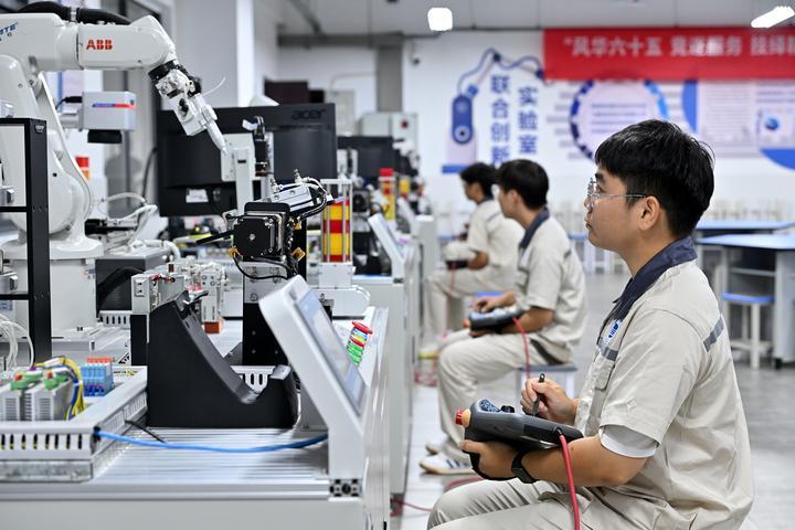 2024年7月26日,湖南鐵道職業技術學院的學生在工業機器人基礎應用實訓室接受工業機器人操控技能訓練。教育部發布的數據顯示,近年來,現代制造業、戰略性新興產業和現代服務業70%以上的新增一線從業人員來自職業院校。職業院校已經成為培養大國工匠、能工巧匠、高技能人才的主陣地。