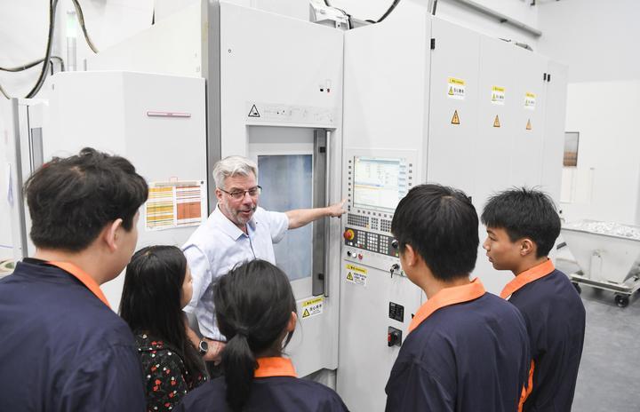 2024年4月16日,在位于重慶市永川區中德產業園的埃斯維(重慶)機床有限公司,公司技術總監向重慶城市職業學院中德產業學院學生介紹設備操作規范。近年來,重慶城市職業學院聯合德國教育力量共建產業學院,引入職業教育先進經驗,著力培養適合制造型企業需求的高素質技能技術人才。