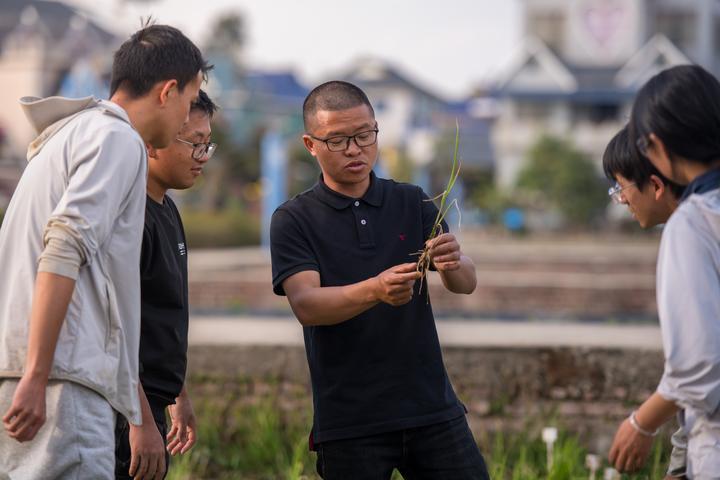 今年37歲的黃光福是云南大學農學院的一名青年教師,同時也是云南大學在云南省勐??h勐遮鎮曼恩村成立的多年生稻科技小院的負責人。多年來,他帶領學生扎根田間,進行技術攻關。團隊利用長雄野生稻特有的地下莖無性繁殖能力,成功培育出“云大25”“云大107”等新品種,突破性地實現水稻“一次栽種、連續收割”,讓“割韭菜般收稻子”的農業成果從實驗室走向田間地頭。這是2025年2月27日,青年教師黃光福(中)在試驗田間給學生授課。