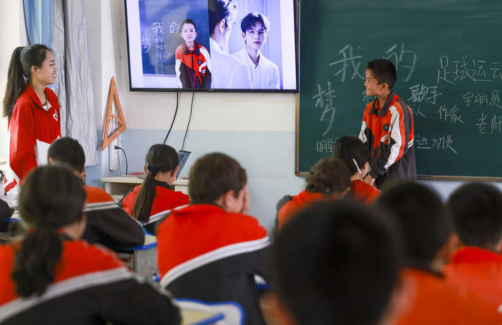 新疆克孜勒蘇柯爾克孜自治州阿圖什市哈拉峻鄉謝依特小學,是一所主要面向柯爾克孜族學生的村級小學,2022年8月成為該州首個西部計劃志愿者包校支教的試點學校。23名戍邊支教西部計劃志愿者服務隊的志愿者,在這所小學承擔著教書育人的工作。經過近三年的支教服務,學生的學習成績顯著提高,得到當地廣泛認可。這是2025年4月23日,支教教師高淑賢(左一)在班級里展示她為學生們制作的“AI夢想職業照”。