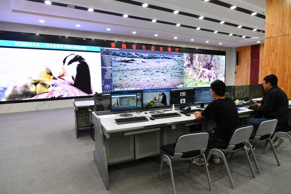 8月8日,青海省生態環境廳信息中心工作人員正在分析野生動物監測畫面。(劉紅 攝)
