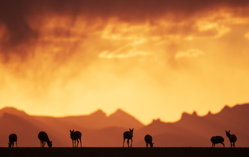 2024年6月16日,在羌塘國家級自然保護區境內的那曲市申扎縣買巴鄉魯確塘草原上,待產的藏羚羊沐浴在晚霞中。藏羚羊是國家一級保護動物,經過多年有效保護,種群數量明顯增長,保護等級從過去的“瀕危物種”降為“近危物種”?!?023西藏自治區生態環境狀況公報》顯示,西藏境內藏羚羊種群已增長至30多萬只。