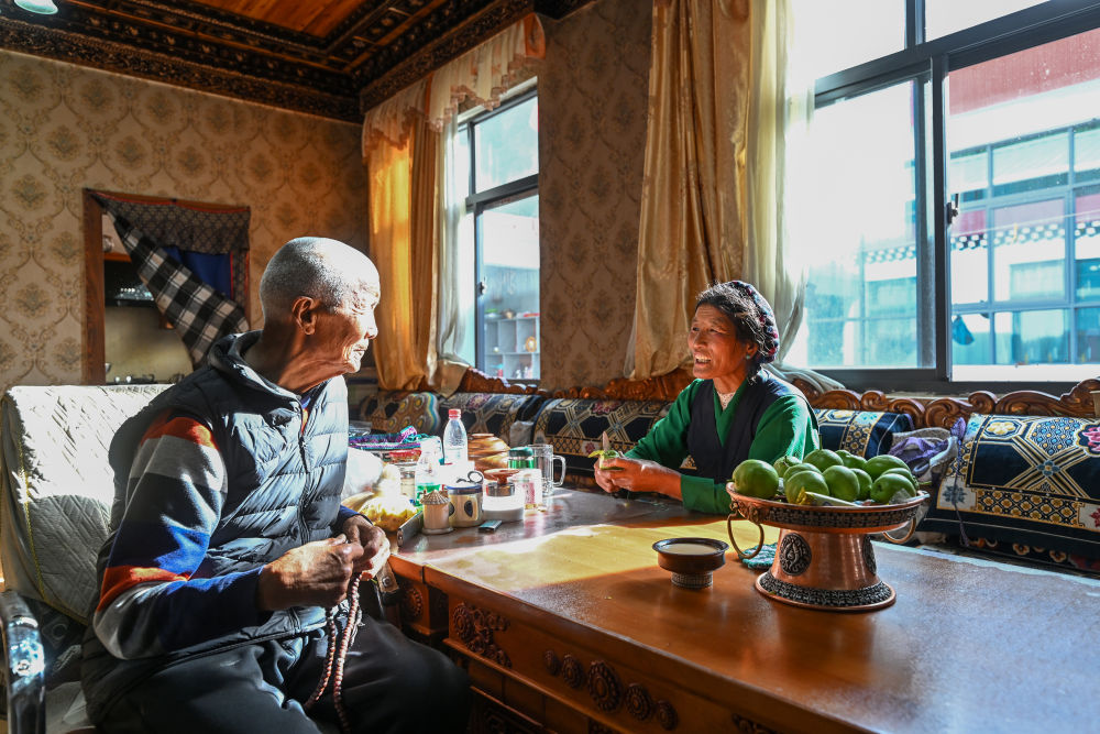 2025年7月21日,58歲的林芝市朗縣拉丁雪村婦聯主席格桑德青(右)在自家改造提升后的餐廳里為88歲的父親喬多吉削水果。近年來,西藏邊境縣朗縣堅持“群眾自愿、因地制宜、循序漸進”原則,推進農村房屋改造提升建設。拉丁雪村采取“政府主導、群眾參與、適當補貼、統規自建”模式,對有意愿的群眾實施住房改造提升。針對村民住房多為石木結構,抗震等級低、采光差等問題,當地聘請專業設計團隊,最大限度滿足群眾房屋功能布局需求。截至2025年7月底,拉丁雪村已有42戶178人入住新房。
