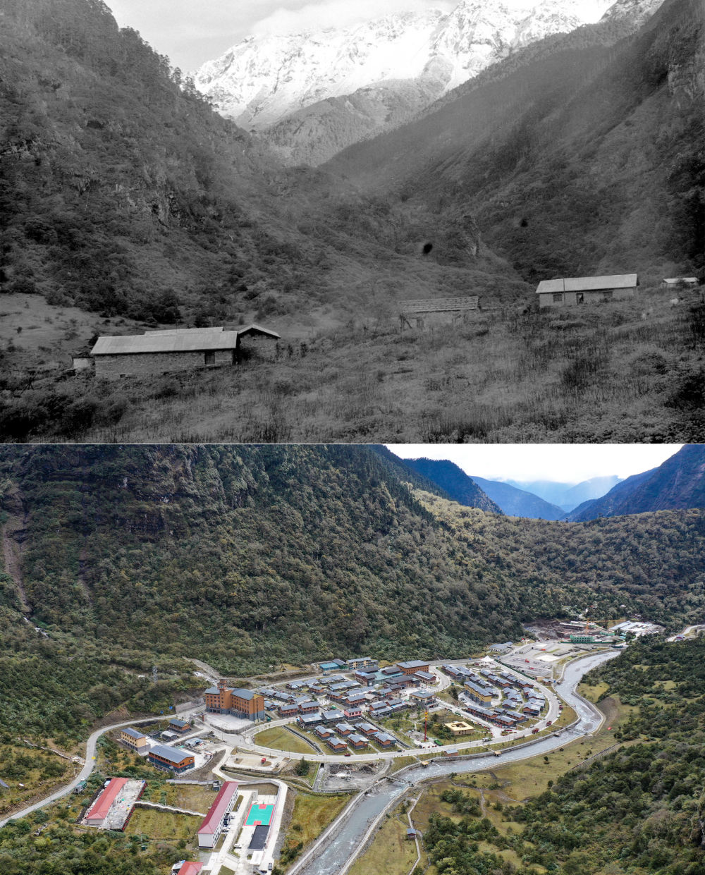上圖為1997年9月拍攝的玉麥鄉;下圖為2024年10月14日拍攝的玉麥鄉。山南市隆子縣玉麥鄉地處喜馬拉雅山脈南麓,受惡劣自然條件影響,這里一度只有桑杰曲巴和女兒卓嘎、央宗三人居住,牢牢守在祖國邊境線上,曾被稱為“三人鄉”。從2018年開始,玉麥鄉開展邊境小康村及配套設施建設,輕鋼龍骨架構民居及排水、通訊、學校、中心公園等公共服務設施拔地而起。2019年,國家投資超5億元、總里程50公里的曲玉柏油公路改建工程全面完工,解除了玉麥每年大雪封山的困擾;同時,國家電網將10千伏的輸電線路接入玉麥,玉麥人用上了安全穩定的常明電。如今,當地已發展到67戶200多人,變成下轄兩個行政村的“小康鄉”。2023年,玉麥全鄉人均年收入超4萬元,人均居住面積達40平方米。