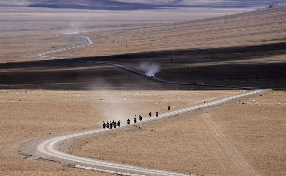 2023年6月2日,50歲的昌果護邊聯防隊隊長石角帶領隊員在日喀則市薩嘎縣昌果鄉騎著摩托車前往33號界樁巡邏。昌果鄉是與尼泊爾接壤的邊境鄉,有105公里的邊境線,5條通外山口。1996年,昌果邊防工作站成立,石角主動申請成為一名聯防隊員。從1個到103個——27年間,這支由普通牧民組成的護邊聯防隊不斷壯大,讓國旗飄揚在國境線的每個角落。