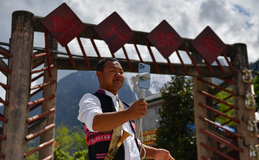 2022年4月19日,生活在僜人聚居村——林芝市察隅縣沙瓊村的僜人迪龍通過手機直播。僜人俗稱“僜巴”,是生活在我國西藏邊境的族群,人口較少。2017年起,迪龍通過制作短視頻、直播帶貨等途徑,介紹僜人文化和察隅縣風情,推廣當地名優特產,讓野生靈芝、羊肚菌等長在深山的寶貝也走向大山外更廣闊的市場。
