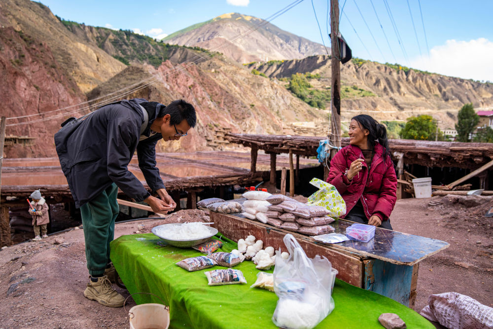 2023年10月20日,昌都市芒康縣納西民族鄉加達村村民在鹽田旁向游客推銷自家產的鹽。加達村位于瀾滄江畔,從唐代開始制鹽,距今已延續1300余年。當地村民保持著原始的手工曬鹽方式,從瀾滄江畔的鹽井、鹽池中取出鹵水倒入鹽田,經陽光蒸曬、風干,結晶成鹽。依托千年古鹽田,當地探索產業融合發展模式,大力發展旅游產業,越來越多的游客慕名“打卡”,帶動村民增收致富。