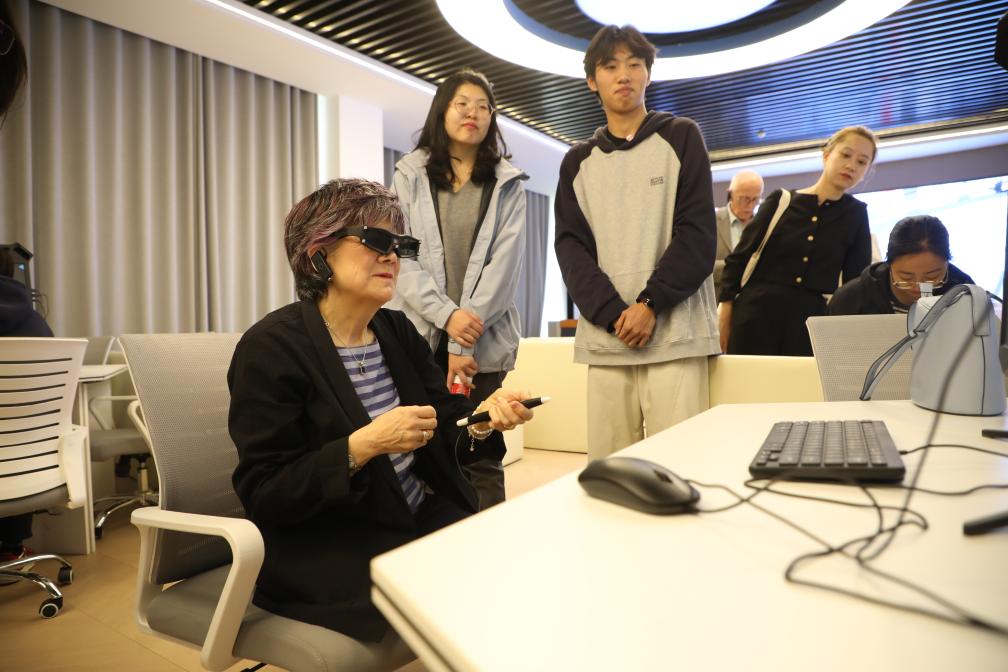 4月15日,在培黎職業學院,英中了解協會榮譽主席佐伊·里德體驗學生們親手設計搭建的虛擬現實場景模型。新華社記者 張智敏 攝