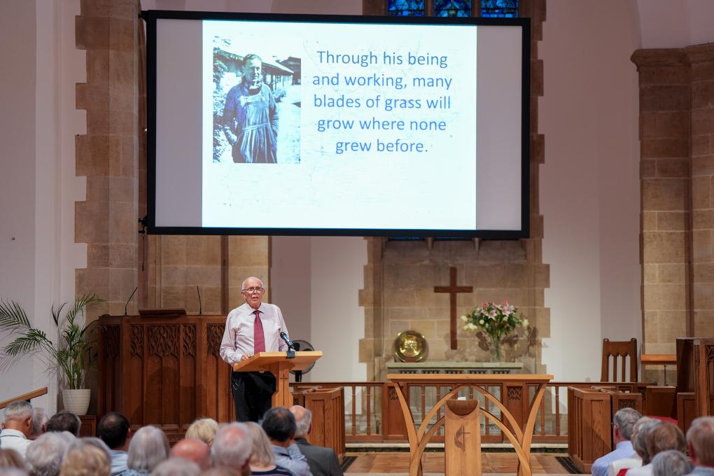 7月22日晚,英國赫特福德郡哈彭登鎮,何克逝世80周年紀念活動現場,座無虛席。屏幕上,一幀幀畫面定格下何克在中國的身影與足跡。講臺上,何克的外甥馬克·艾爾溫·托馬斯深情講述80多年前的往事。