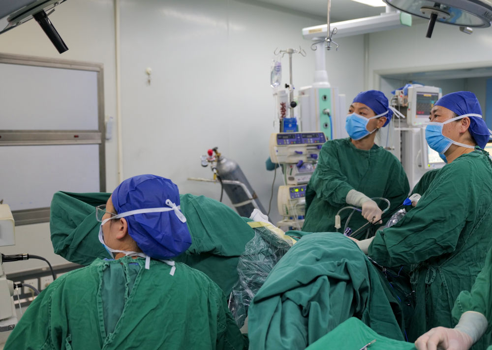 2025年8月4日,北京大學人民醫院第十批援藏婦科醫生張果(中)與西藏自治區人民醫院醫生李芳(左)一起為患者做手術。新華社發(柑丹鴦琦攝)
