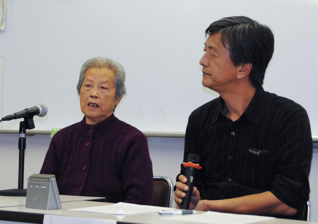 2014年12月7日,艾義英(左)在日本大阪參加證言集會,講述自己在南京大屠殺中的親身經歷。新華社記者 馬興華 攝