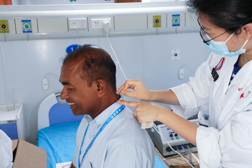 2024年12月24日,在斯里蘭卡科倫坡港,中國海軍“和平方舟”號醫院船上的醫生為當地居民做針灸治療。2024年12月,執行“和諧使命-2024”任務的中國海軍“和平方舟”號醫院船??吭诳苽惼赂?。船上17個臨床科室、5個輔助診療科室的100余名醫護人員,可開展60余種檢查治療或手術。許多斯里蘭卡民眾不遠千里而來,獲得中國醫生的診療救助。
