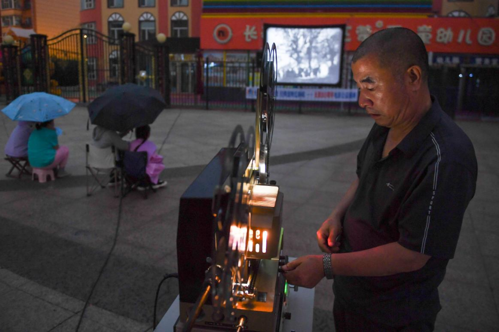 2025年8月15日,在長春市南關區鵬程社區,社區志愿者王學會為市民播放膠片電影《地道戰》。