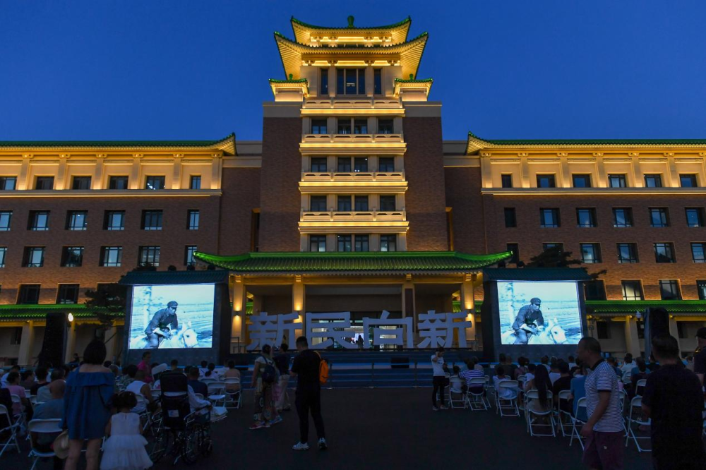 2025年8月14日,市民在長春歷史博物館前觀看露天電影《偵察兵》。