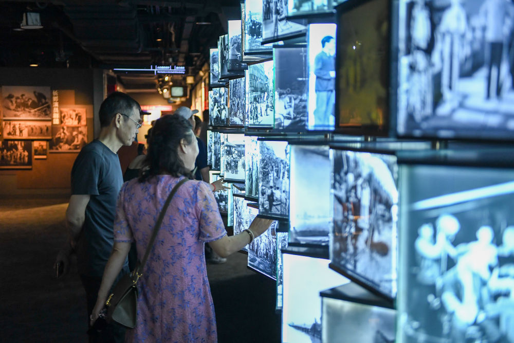 2025年8月7日,游客在長影舊址博物館觀看長春電影制片廠攝制團隊早期拍攝電影時的工作照。