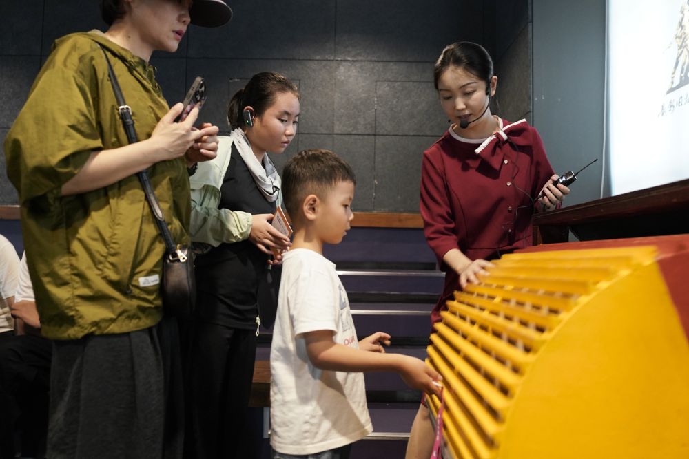 2025年8月7日,小朋友在長影舊址博物館擬音互動室參觀體驗。