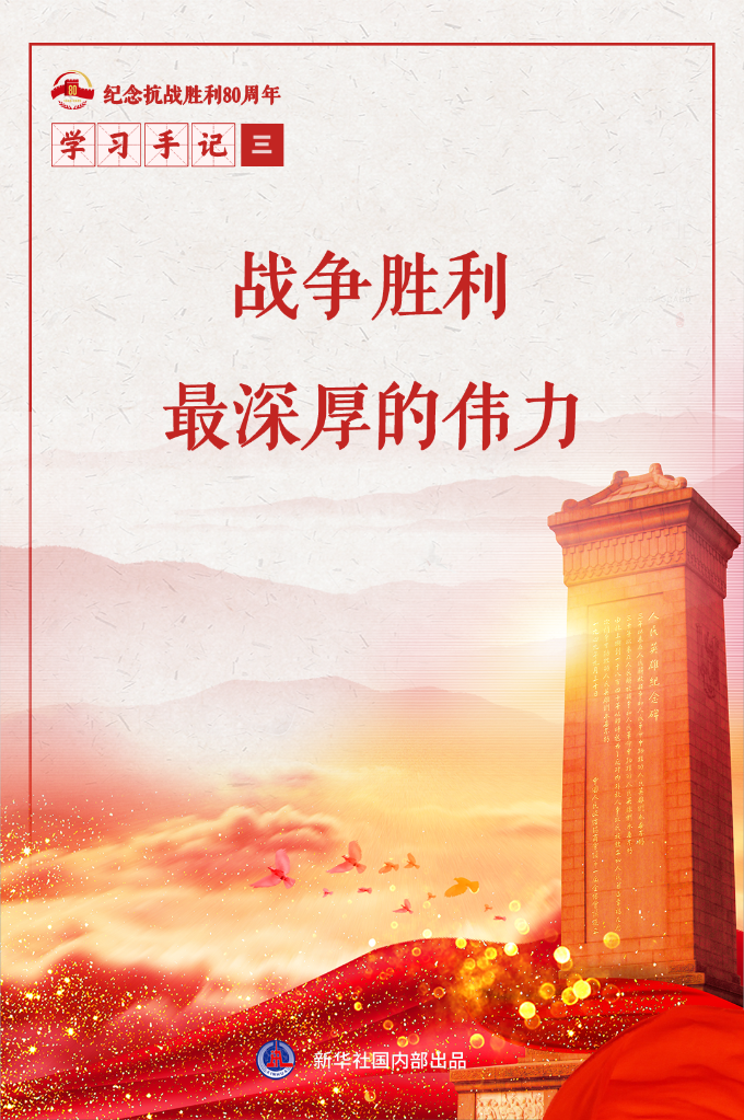 民族危亡之際,中國人民迸發出勢不可擋的力量。中國人民抗日戰爭勝利是全體中華兒女勠力同心、以弱勝強的雄渾史詩,顯示了中國人民和中華兒女堅不可摧的磅礴力量。
