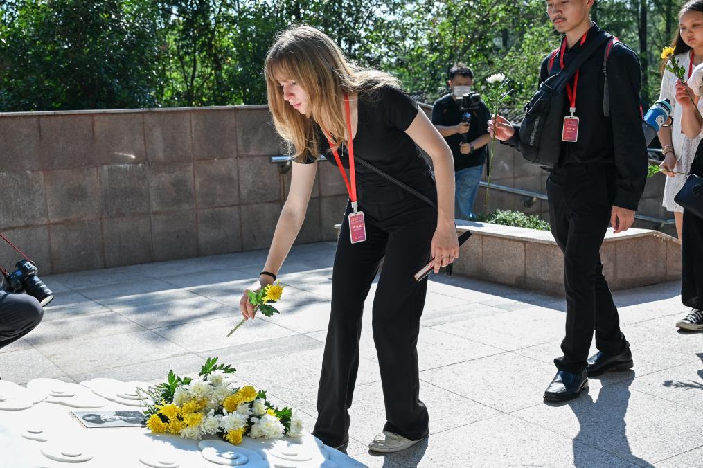 7月28日,在湖北省黃岡市紅安縣,美國“飛虎隊”夏令營代表團成員排隊在飛虎隊隊員格倫·本尼達墓碑前獻花。新華社記者 杜子璇 攝