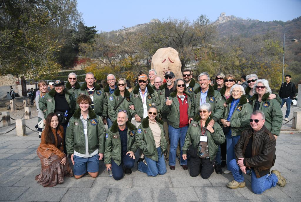 2023年10月29日,飛虎隊老兵莫耶一行人在北京八達嶺長城合影留念。 新華社記者 任超 攝