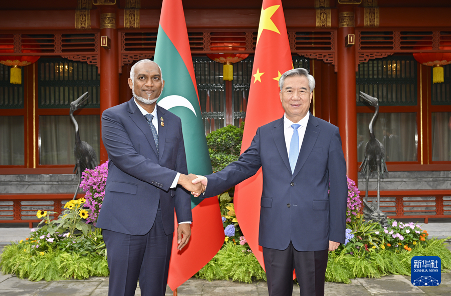 9月2日,中共中央政治局常委、中央紀委書記李希在北京會見來華出席2025年上海合作組織峰會和紀念中國人民抗日戰爭暨世界反法西斯戰爭勝利80周年活動的馬爾代夫總統穆伊茲。新華社記者 岳月偉 攝