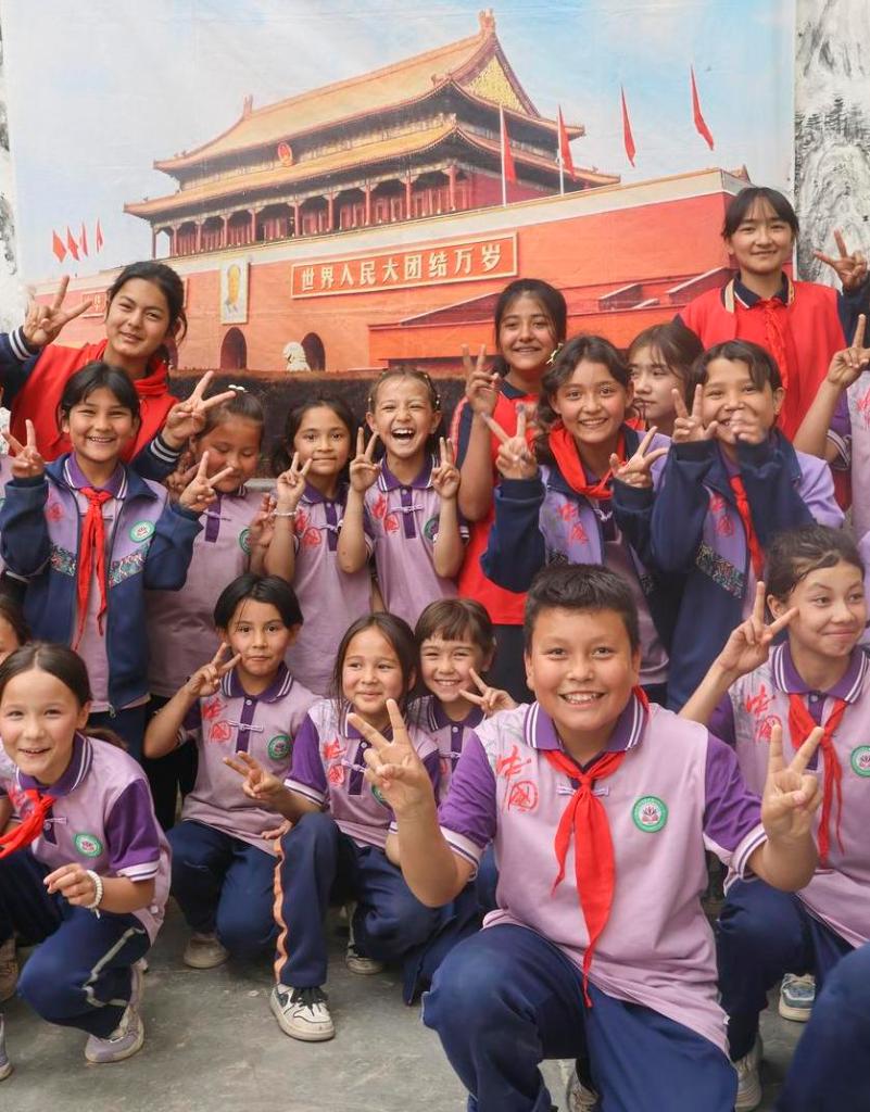 一次拍合影,70多歲的老人摸著背景布上的紅墻,念叨著:“你看現在,我們住的房是北京援疆修的,孩子校服上印著‘北京援疆’,連天安門都‘來’沙漠看我們了!”
