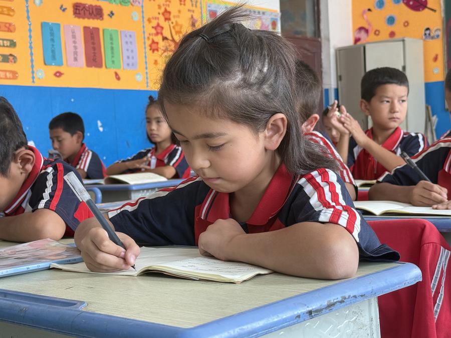 9月17日,鄯善縣達朗坎鄉中心學校三年級四班學生乃則熱與同學們上數學課。(受訪者供圖)