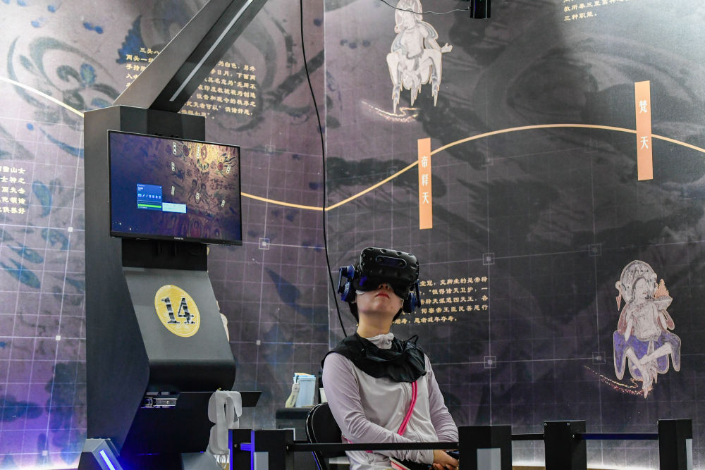 2024年7月22日,游客在“尋境敦煌——數字敦煌沉浸展”借助VR設備沉浸式游覽莫高窟第285窟虛擬場景?!皩ぞ扯鼗汀獢底侄鼗统两埂本C合運用VR虛擬現實、三維建模、游戲引擎的物理渲染和全局動態光照等新技術,高精度立體還原了莫高窟第285窟。游客戴上VR眼鏡,不僅可以零距離觀賞壁畫、360度自由探索洞窟細節,還能“飛升”到窟頂,身臨其境參與壁畫故事情節,沉浸式感受敦煌文化的魅力。