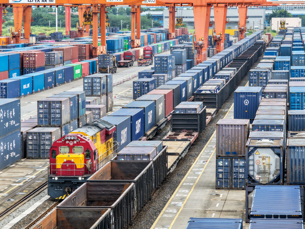 2025年9月8日,滿載“重慶造”汽車的中歐班列(成渝)在重慶團結村中心站等待發車(無人機照片)。新華社記者 唐奕 攝