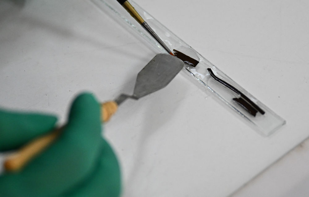 2025年4月24日,荊州文物保護中心簡牘工作室工作人員在處理竹簡殘片。