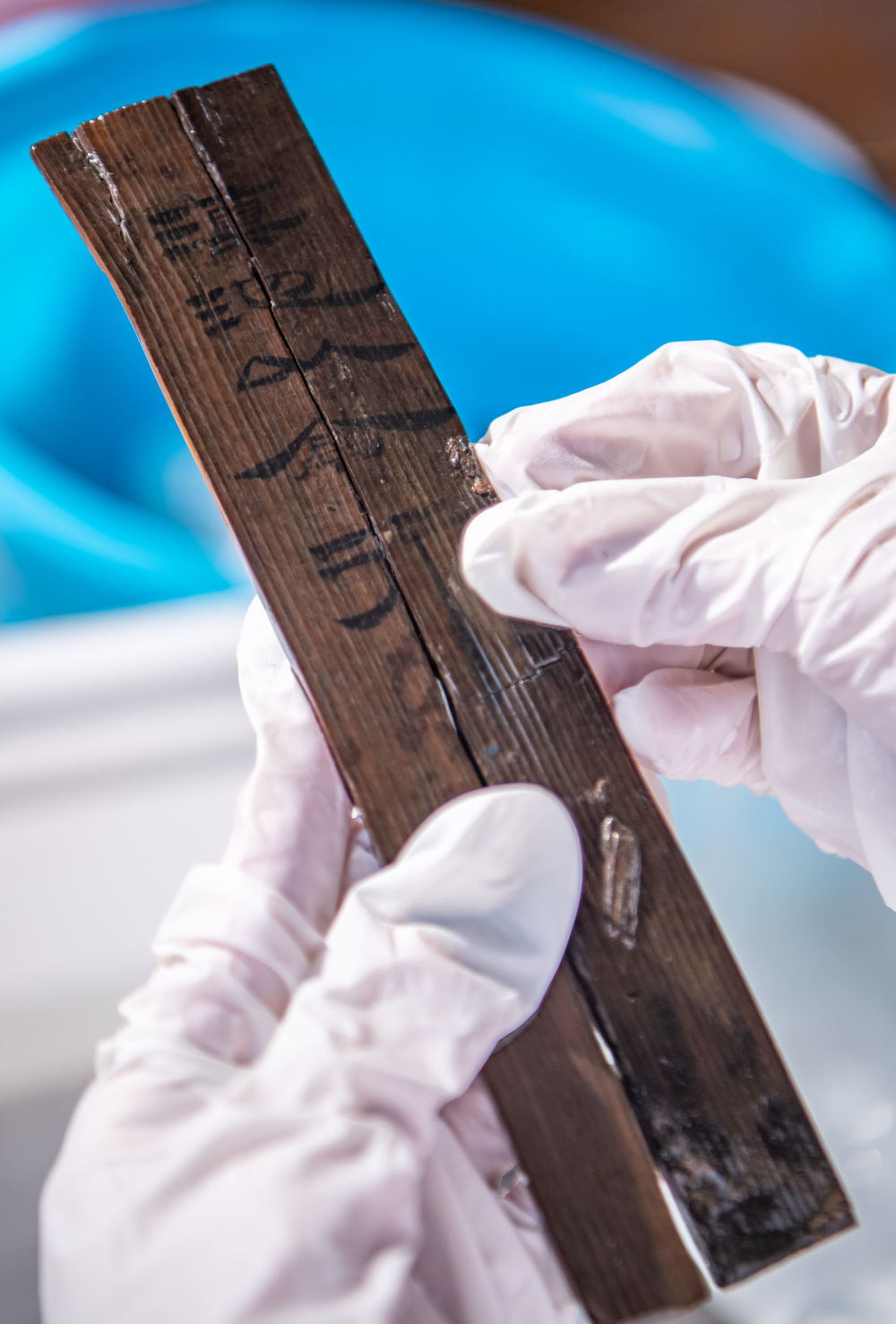 考古工作者在清理云南河泊所遺址出土的簡牘(2022年9月21日攝)。