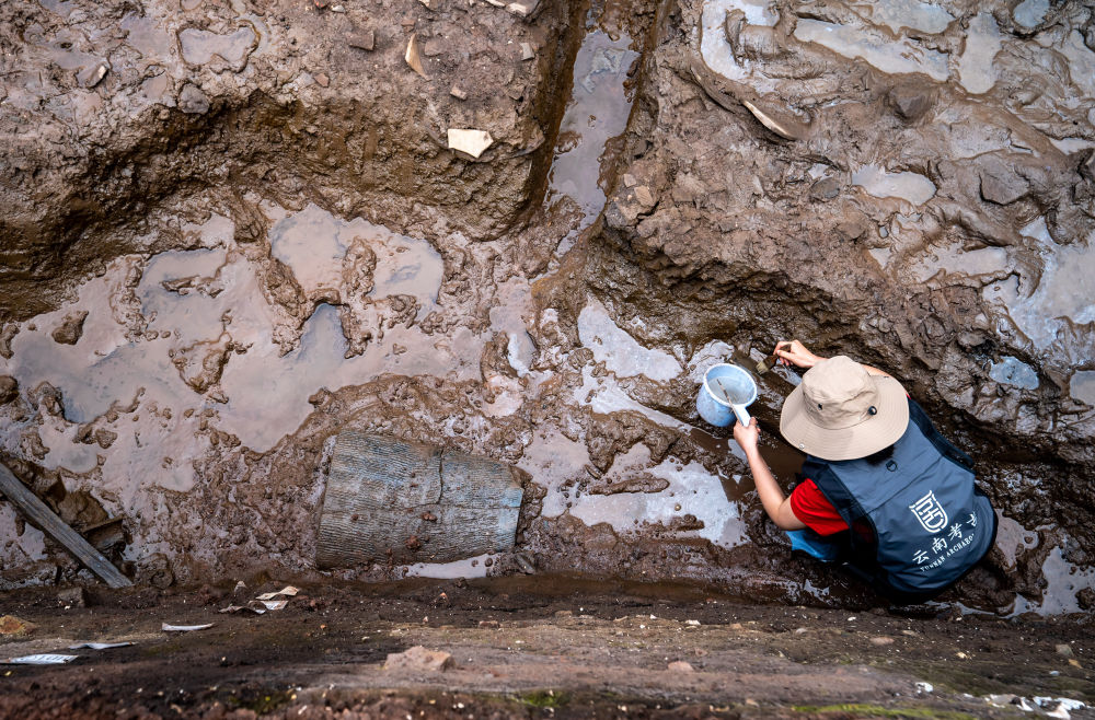 考古工作者在云南河泊所遺址現場進行清理發掘工作(2022年9月21日攝)。近年來,古滇國考古獲得重大突破,云南河泊所遺址出土大量漢代封泥和簡牘。這表明西漢中央政府已對云南行使治權,是我國統一多民族國家形成與發展的重要實證。