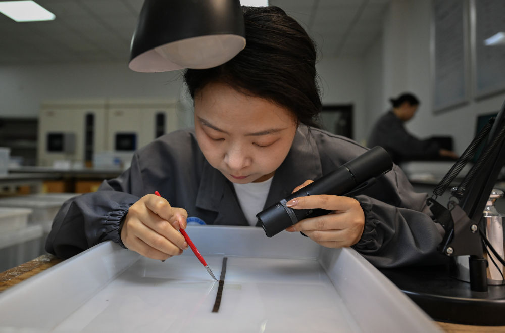 2025年4月24日,荊州文物保護中心簡牘工作室工作人員在清理竹簡。成立于2003年的荊州文物保護中心簡牘工作室承擔了全國約80%的簡牘保護工作。結合多項重大科研課題研究,中心文保工作者成功研發出一系列竹木簡牘保護關鍵技術,針對飽水簡牘出土后因環境改變、水分流失、微生物入侵等導致的病害問題,提供了有效的解決方案。
