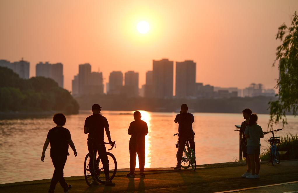 騎行的市民在渾河岸邊駐足欣賞夕陽。新華社記者 蔡湘鑫 攝