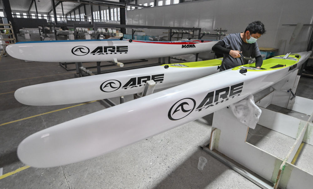 2025年4月24日,在湖北省荊州市公安縣速力復合材料有限公司的生產車間內,工人裝配海洋船。2024年,速力復材成為巴黎奧運會新增的風帆水翼賽事唯一指定生產商。公安縣已有多個體育特色用品獲得國際客戶青睞,產品銷往荷蘭、英國、法國、德國等國家。