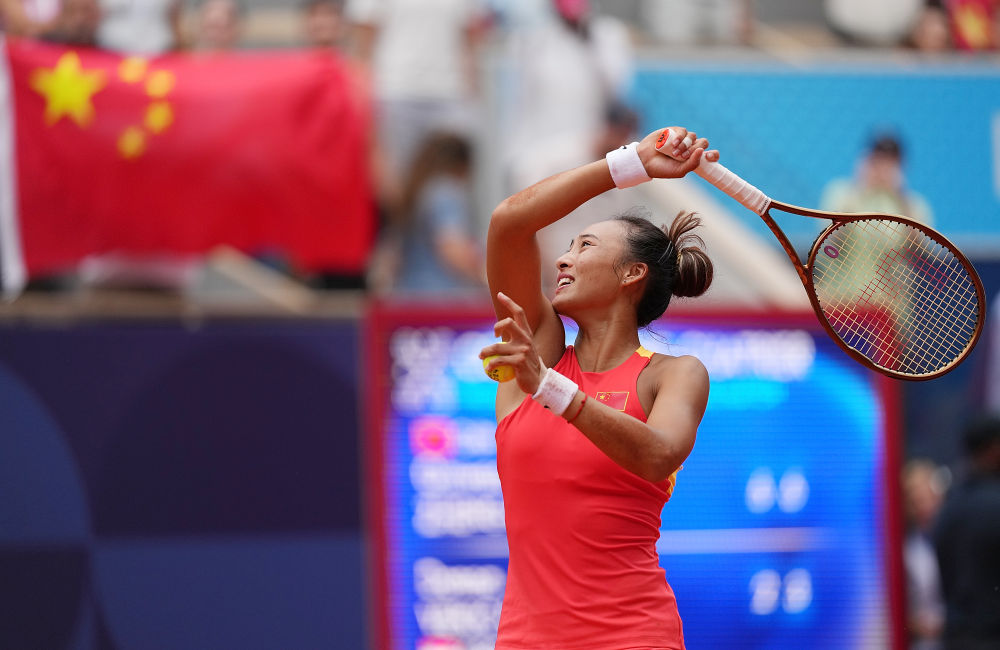 2024年8月3日,在巴黎奧運會網球女子單打金牌賽中,中國選手鄭欽文2比0戰勝克羅地亞選手維基奇,奪得金牌。這是鄭欽文慶祝奪冠。