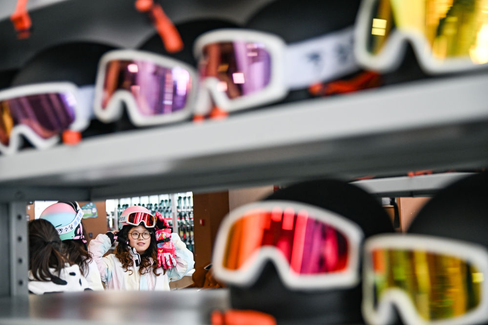 2024年12月27日,在四川省汶川縣羌人谷滑雪場,滑雪愛好者租賃滑雪裝備。