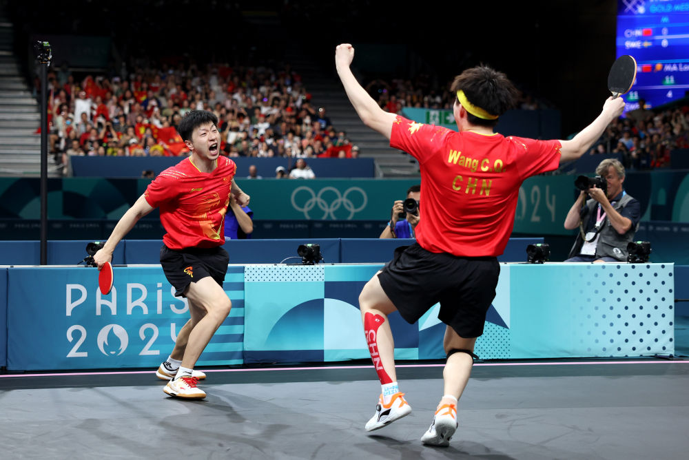 2024年8月9日,在巴黎奧運會乒乓球男團金牌賽中,中國隊戰勝瑞典隊,獲得冠軍。這是中國隊組合馬龍(左)/王楚欽慶祝勝利。