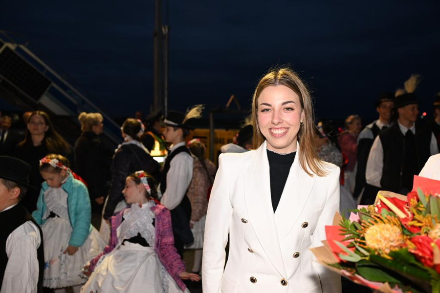 當地時間5月8日晚,在匈牙利布達佩斯國際機場歡迎隊伍中的匈牙利姑娘歐拉·塔瑪拉。新華社記者 謝環馳 攝