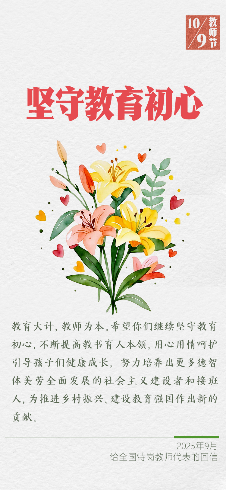 在第四十一個教師節到來之際,習近平總書記給全國特崗教師代表回信,提出殷切希望,并向全國廣大教師和教育工作者致以節日祝賀和誠摯問候。
