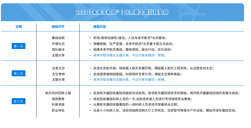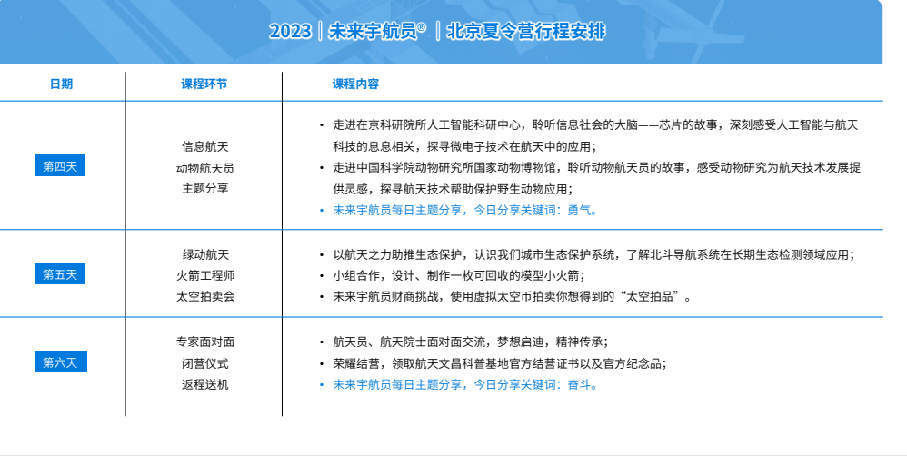 參觀航天與中科院科研相關院所,探秘航天前沿科技,完成航天應用體驗實踐,與專家面對面,親身感受航天精神。在航天專家的帶領下,走進航天試驗場及航天應用領域研究中心開展北斗導航與城市熱島效應研究、月球著陸實驗、動物仿生學賦能航天應用、物理與航天之問、衛星的眼睛——紅外熱成像光學等主題研究及實驗,在中國航天科技領域開展最前沿的跨學科工程具體實踐任務。